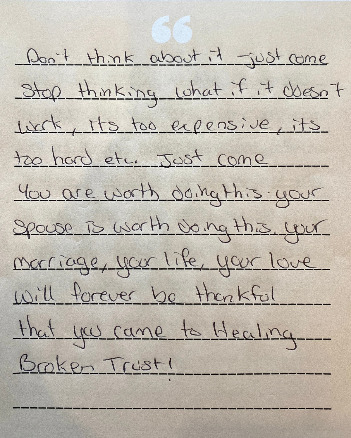 The Healing Broken Trust workshop was objective, speaking to both roles we play as pursuers and distancers. ‘Why we do what we do’ was addressed and ‘why we feel what we feel’ was addressed as pursuers and distancers. It was helpful to hear from other couples experiences and make new friends in the same situation as us. It was helpful for my husband to hear what the characteristics the unfaithful have in common, and him hearing about limerence helped us leave the workshop knowing why the affairs had occurred.